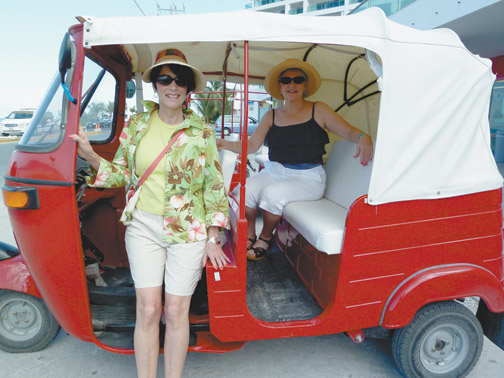 The Bajaj is best described as a luxury motor driven rickshaw. The front seat comfortably carries the driver and the backseat will hold three adults. Instead of a simulated leather steering wheel, the Bajaj comes standard with motorcycle-style handle bars. And, it’s a convertible.
