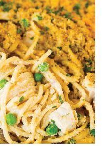 - Add turkey, peas, cheese, and oregano and toss until combined. Add cooked spaghetti and toss to coat; season with salt and pepper. Transfer mixture into prepared dish.